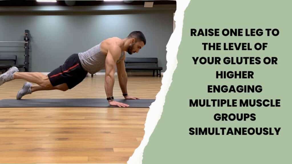 After 30 seconds, switch to the other leg to achieve a balanced workout. This exercise effectively targets your core muscles, including the back, abs, and glutes, while also engaging the chest, neck, shoulders, and back thighs. By incorporating the Raised Leg Plank into your routine, you’ll enhance your overall strength, stability, and muscular endurance, taking your plank workout to the next level.