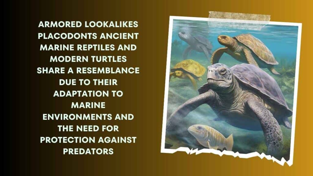 Armored Lookalikes Placodonts, ancient marine reptiles, and modern turtles share a resemblance due to their adaptation to marine environments and the need for protection against predators. Placodonts emerged around 235 million years ago, while turtles appeared approximately 100 million years later. Both groups developed strong shells to safeguard themselves, displaying a remarkable case of convergent evolution despite their significant temporal gap.